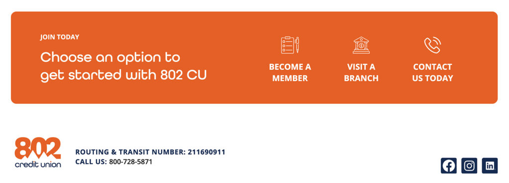802 Credit Union is a Vermont-based, member-owned financial institution offering a full range of personal banking services, from checking and savings accounts to loans, credit cards, and digital banking tools. Deeply rooted in their local communities, 802CU exists to support Vermonters with accessible financial services, local decision-making, and a people-first approach to banking.